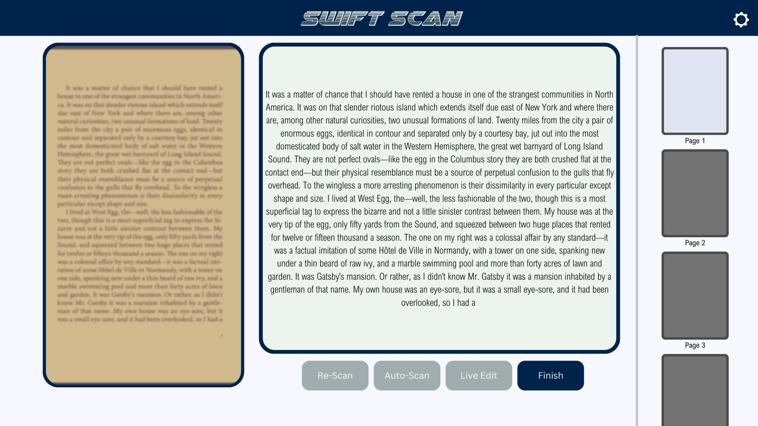 Swift Scan is an OCR web application designed for efficient text extraction and editing. With its robust scanning capabilities, it converts images of text into digital format, allowing users to make live edits directly within the app. Additional features such as auto-scan and re-scan ensure accuracy and flexibility, making Swift Scan ideal for users seeking quick and reliable text conversion and adjustment on the go.